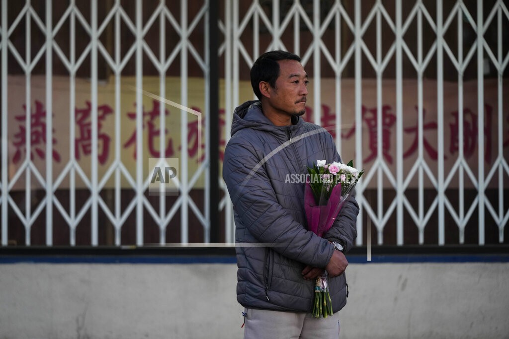 Hunter Zhao, de 41 anos, segura flores para homenagear as vítimas mortas no tiroteio de sábado no estúdio de dança de salão em Monterey Park, Califórnia, EUA, em 22 de janeiro de 2023